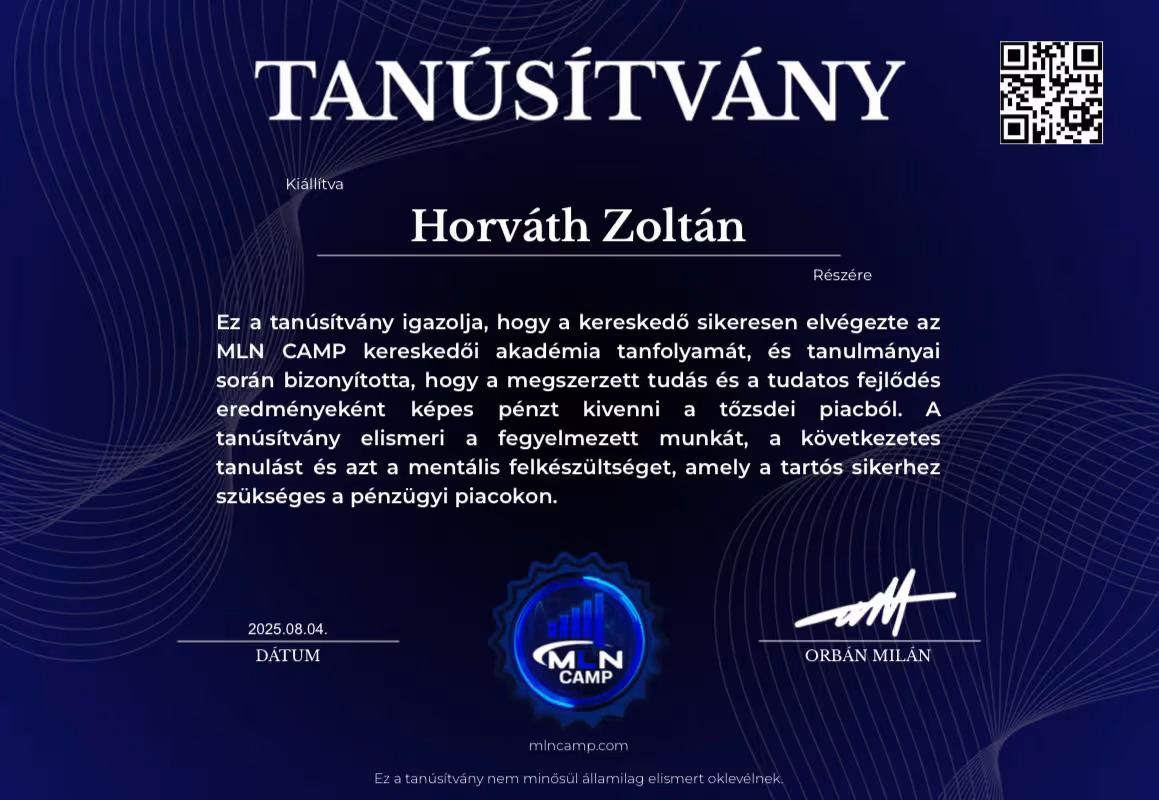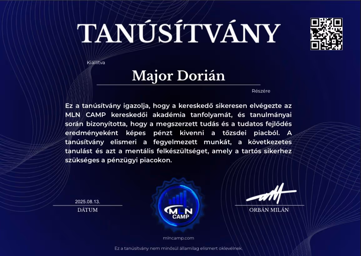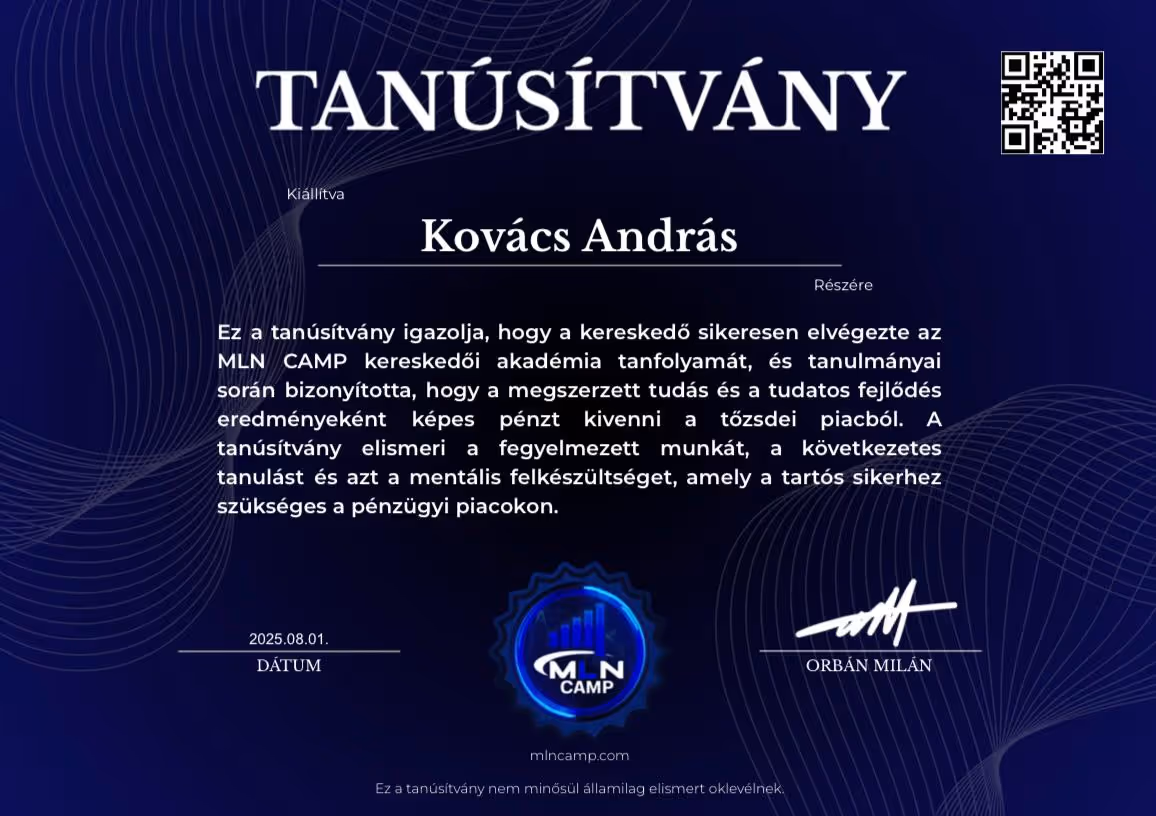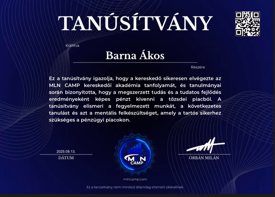 "Orbán Milán vagyok. A tőzsdei kereskedést akkor kezdtem, miután sérülésem miatt félbeszakadt a futballkarrierem. 16 évesen mindent kipróbáltam – dropshippinget, értékesítést, ruházati márkákat –, de semmi sem jelentett akkora kihívást és változást, mint a kereskedés.Több mint 2 évig vesztettem a pénzt.Nem volt mentorom. Nem volt támogatásom. Csak önképzés, késő estig tartó munka és egy álom.Mára úgy érzem jó úton haladok az álmaim elérésében – jövedelmező kereskedés, saját cégem, az első álomautóm és egy motivált tanulókból álló közösség.MLN CAMP az akadémia, amilyet szerettem volna, ha lett volna amikor elkezdtem.Majd ezzel a céllal építettem fel,hogy senkinek se kelljen keresztül mennie azon az úton amin nekem kellett a profitáláshoz."