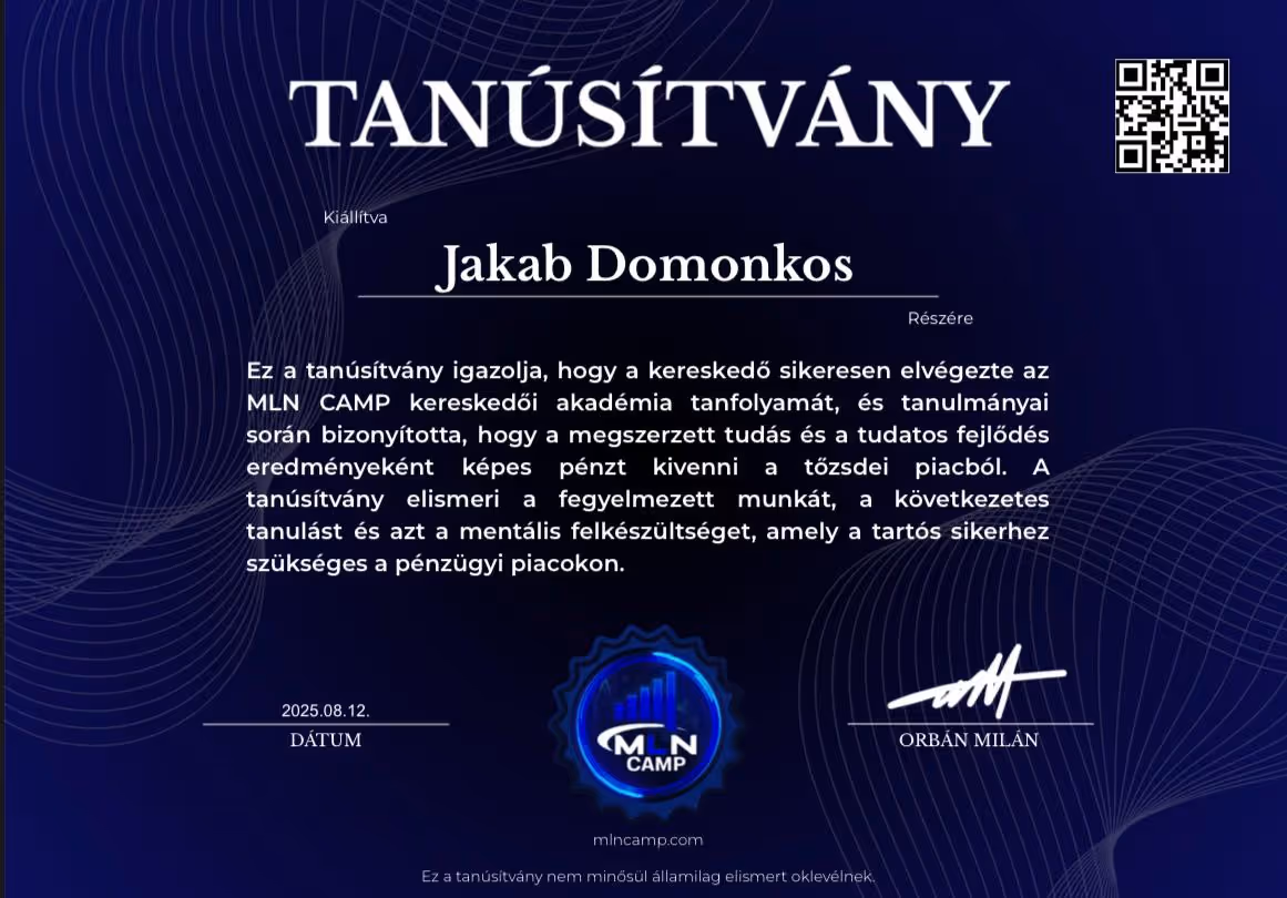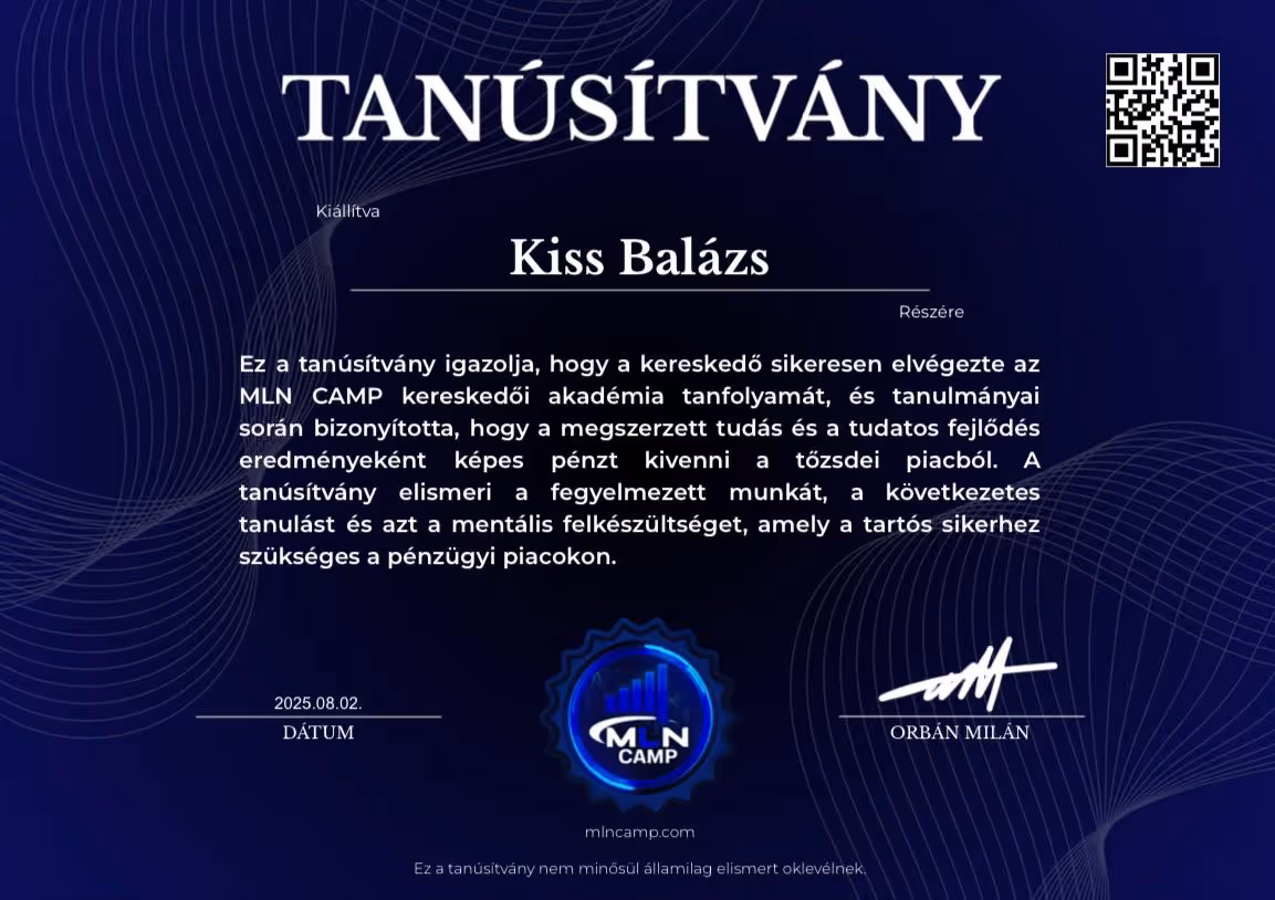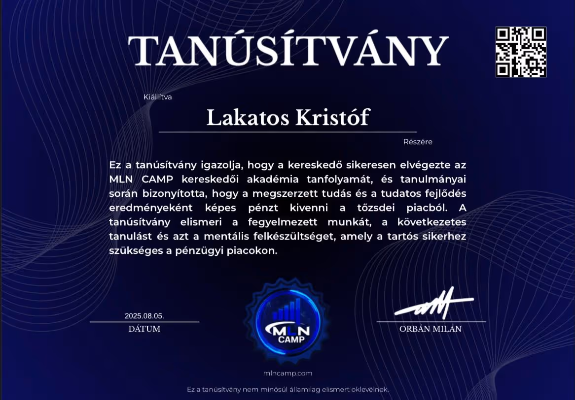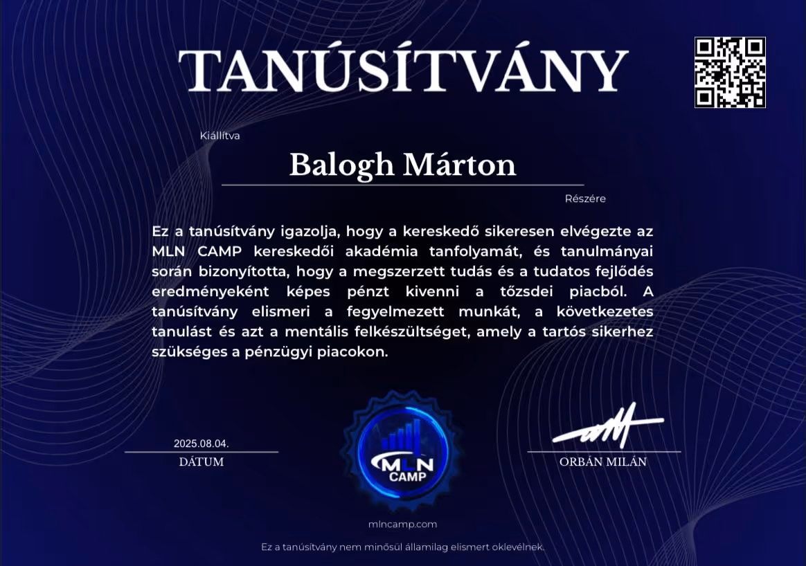 "Orbán Milán vagyok. A tőzsdei kereskedést akkor kezdtem, miután sérülésem miatt félbeszakadt a futballkarrierem. 16 évesen mindent kipróbáltam – dropshippinget, értékesítést, ruházati márkákat –, de semmi sem jelentett akkora kihívást és változást, mint a kereskedés.Több mint 2 évig vesztettem a pénzt.Nem volt mentorom. Nem volt támogatásom. Csak önképzés, késő estig tartó munka és egy álom.Mára úgy érzem jó úton haladok az álmaim elérésében – jövedelmező kereskedés, saját cégem, az első álomautóm és egy motivált tanulókból álló közösség.MLN CAMP az akadémia, amilyet szerettem volna, ha lett volna amikor elkezdtem.Majd ezzel a céllal építettem fel,hogy senkinek se kelljen keresztül mennie azon az úton amin nekem kellett a profitáláshoz."